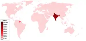 Индуизм исповедуют более 1 млрд человек — это третья по числу последователей религия в мире после христианства и ислама[13]. Индуисты составляют большинство населения Индии и Непала[14]. Значительное количество приверженцев индуизма насчитывается в таких странах, как Бангладеш, Шри-Ланка, Пакистан, Индонезия, Малайзия, Сингапур, Маврикий, Фиджи, Суринам, Гайана, Тринидад и Тобаго, Великобритания, Канада и США.