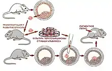 Впервые ИПСК были получены в виде перевиваемой тератокарциномы, индуцированной трансплантатом, взятым из мышиных эмбрионов[95]. Было доказано, что тератокарциномы образуются из соматических клеток[96]. Тот факт, что из клеток тератокарциномы можно получить нормальную мышь доказывал их плюрипотентность[97][98][99]. Оказалось, что клетки тератокарциномы, выделяя в культуральную среду различные факторы, способны поддерживать культуру плюрипотентных стволовых клеток эмбриона в недифференцированном состоянии[100]. Таким образом, ещё в 1980-е годы стало ясно[101][102][103], что трансплантация плюрипотентных или эмбриональных стволовых клеток во взрослый организм млекопитающих обычно приводит к образованию тератомы, которая затем может превратиться в злокачественную опухоль — тератокарциному[104]. Если, однако, поместить клетки тератокарциномы в ранний зародыш млекопитающего (на стадии бластоцисты), то они включаются в состав клеточной массы бластоцисты и из такого химерного (то есть состоящего из клеток от разных организмов) эмбриона нередко развивается нормальное химерное животное. Почти во всех органах и тканях которого часть дифференцированных клеток происходит из клеток тератокарциномы, которые совместно с клетками нормального происхождения участвуют в построении здорового организма[102][103][105]. Это свидетельствовало о том, что причиной образования тератомы является диссонанс в стадии развития донорных клеток и окружающих их клеток реципиента (так называемой ниши). Уже тогда, используя ретровирусные векторы, удалось ввести инородные гены в мышиные химеры, полученные с помощью клеток тератокарциномы[106].