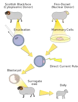 - пересадка ядер, взятых из соматических клеток, в оплодотворённую яйцеклетку, из которой предварительно удалено ядро[1][7]