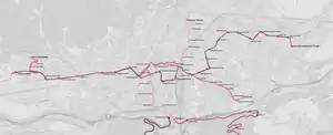 Трамвайная система имеет ширину колеи 1000 мм, протяжённость 19,5 км, эксплуатируются три линии.