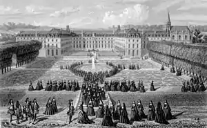 Инициатором создания приюта и его первым руководителем была мадам де Ментенон, вторая жена короля Людовика XIV. По её настоянию король в 1684 году распорядился организовать учреждение для воспитания 250 благородных девиц — сирот либо дочерей обедневших дворян, которые ввиду сложного материального положения были не в состоянии дать дочерям достойного образования. В селе Сен-Сир по соседству с Версалем король поручил своему архитектору Ардуэн-Мансару возвести учебный корпус. Строительные работы шли быстро и заняли всего 15 месяцев.
