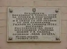 - с 1976 по 1992 — Ростовское-на-Дону ордена "Знак Почёта" мореходное училище им. Г. Я. Седова;