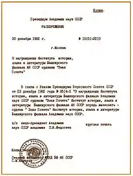 В 1982 году Институт Указом Президиума Верховного Совета СССР от 23 декабря 1982 г. был награждён орденом «Знак Почёта».