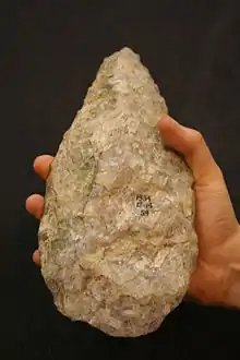 Возможно, изготовлять орудия умели массивные австралопитеки Paranthropus robustus[15] Австралопитеки достигли степени развития, позволяющей не только использовать в качестве орудий уже имеющиеся предметы, но и изготавливать их. Человек умелый (лат. Homo habilis) и человек прямоходящий (лат. Homo erectus), создатели олдувайской культуры (2,6—1 млн лет назад). Человек умелый использовал для изготовления инструментов кварц, месторождение которого находилось в нескольких километрах от стоянки. К произведённым инструментам относился не бережно, не хранил их, и после использования выбрасывал.
