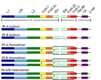 Первоначально транскрипты альтернативных вариантов сплайсинга гена INSR транслируются с образованием одного из двух мономерных изомеров: IR-A, в котором вырезан экзон 11, и IR-B, в котором есть экзон 11. Включение экзона 11 приводит к добавлению 12 аминокислот выше фурина в сайте протеолитического расщепления.