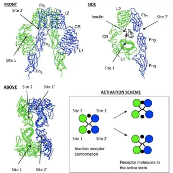 Эти модели утверждают, что каждый мономер IR имеет 2 инсулиновых сайта связывания; Сайт 1, который связывается с «классической» поверхностью связывания инсулина: состоящей из L1 плюс αCT доменов и сайта 2, состоящий из петель на стыке FnIII-1 и FnIII-2, по прогнозам, связывающихся с «новым» гексамерным лицом сайта связывания инсулина[1]. Так как каждый мономер предоставляет IR эктодомену представление 3D «зеркальной» взаимодополняемости, N-терминальный сайт 1 из одного мономера, в конечном счете сталкивается с C-терминальным сайтом 2 второго мономера, что также верно для каждого зеркального дополнения мономеров (противоположная сторона структуры эктодомена). Текущая литература отличает сайты связывания дополнений, назначив на сайте 1 и 2 мономерные сайты дополнений, как 3 и 4 или как сайт 1' и 2' соответственно[1][10].