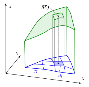 Понятие двойного интеграла возникает при вычислении объёма цилиндрического бруса, подобно тому, как определённый интеграл связан с вычислением площади криволинейной трапеции. Рассмотрим некоторую двумерную фигуру на плоскости и заданную на ней функцию двух переменных . Понимая эту функцию как высоту в данной точке, поставим вопрос о нахождении объёма получившегося тела (см. рисунок). По аналогии с одномерным случаем, разобьём фигуру на достаточно малые области , возьмём в каждой по точке и составим интегральную сумму