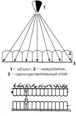 Полученное в результате мнимое изображение снятых объектов является их оптической копией[2]. Оно обладает стереоскопичностью и многоракурсностью, создавая иллюзию существования снятых предметов, «висящих» на том же расстоянии от светочувствительной поверхности, на котором они находились в момент съёмки. Объём воспроизводится за счёт того, что каждый глаз видит снятый объект со своего ракурса, который зависит от конкретной группы микролинз, участвующих в наблюдении. Точность воспроизведения хода лучей такова, что приводит к такой же аккомодации хрусталиков, как при наблюдении реальных объектов. Технология изобретена в 1908 году Габриэлем Липпманом, и предвосхитила аналогичную по свойствам и возможностям голографию[3].