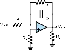 Дальнейшее повышение точности электронных аналоговых интеграторов можно достичь применяя в качестве активных компонентов операционные усилители (ОУ). Упрощённая схема такого интегратора приведена на рисунке. Идеальный ОУ имеет бесконечный коэффициент усиления и бесконечное входное сопротивление (нулевой входной ток), современные реальные ОУ по этим параметрам приближаются к идеальным — имеют коэффициент усиления более нескольких сотен тысяч и входные токи менее 1 нА и даже пА. Поэтому при упрощенном анализе цепей с ОУ обычно допускают, что ОУ идеальный.