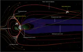 - Хвост магнитосферы. Дата обращения: 21 апреля 2021. Архивировано 5 сентября 2019 года. — область магнитосферы на ночной стороне Земли, простирающаяся на расстояние до 1 500 000 км. Силовые линии магнитного поля в хвосте разомкнуты, линии разной полярности разделены слоем высокотемпературной плазмы, окружающим нейтральный слой. Плазменный слой является резервуаром заряженных частиц, формирующих радиационные пояса Земли.