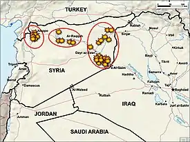 Начиная с 22 сентября 2014 года ВВС США и их союзников приступили к ночным бомбардировкам территорий, занятых боевиками «Исламского государства».[41][42] Самолёты Бахрейна, Иордании, Катара, Саудовской Аравии и Объединённых Арабских Эмиратов присоединились к первым атакам на тренировочные лагеря террористов, расположенные в сирийских провинциях Ракка и Алеппо[43]. Координацию авиаударов взяло на себя Центральное командование вооружённых сил США[44]. Были выбраны 20 объектов, используемых активистами ИГИЛ[45], а также группировкой Фронт ан-Нусра (близкой к террористической организации «Аль-Каида»).[46][47]