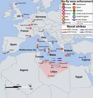Интервенция в Ливии — военное вмешательство сил международной коалиции (в основном стран блока НАТО) в гражданскую войну в Ливии, санкционированное Резолюцией Совета Безопасности ООН 1973, принятой 17 марта 2011 года, декларирующей защиту мирных жителей как цель вооружённого вмешательства (см. Гуманитарная интервенция)[46][47].