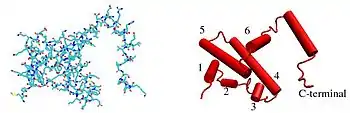 IFNγ мономер состоит из ядра из шести α-спиралей и расширенной развернутой последовательности в С-концевой области.[10][11] Это показано в структурных моделях ниже. α-спирали в ядре структуры пронумерованы от 1 до 6.