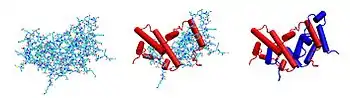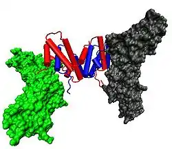 Биологически активный димер образуется путем антипараллельного взаимоблокирования двух мономеров, как показано ниже. В нарисованной модели один мономер показан красным цветом, другой – синим.