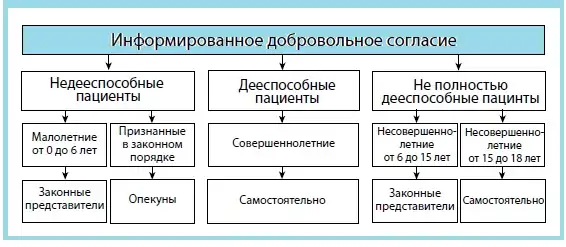 - несовершеннолетние от 6 до 18 лет ограниченно дееспособны (ст.26, 28 ГК РФ[15]), тем не менее с 15 лет, согласно ФЗ «Об основах охраны здоровья граждан в Российской Федерации», имеют право на добровольное информированное согласие на медицинское вмешательство, таким образом с 6 до 15 лет за несовершеннолетнего согласие дают законные представители, с 15 лет до 18 лет — несовершеннолетние самостоятельно, хотя при этом и могут воспользоваться помощью родителей или законных представителей, тем не менее подписывают бланк самостоятельно;