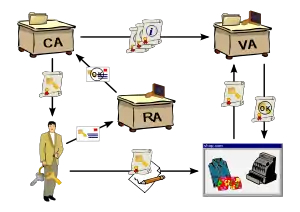- Регистрационный центр (РЦ) — необязательный компонент системы, предназначенный для регистрации пользователей. Удостоверяющий центр доверяет регистрационному центру проверку информации о субъекте. Регистрационный центр, проверив правильность информации, подписывает её своим ключом и передаёт удостоверяющему центру, который, проверив ключ регистрационного центра, выписывает сертификат. Один регистрационный центр может работать с несколькими удостоверяющими центрами (то есть состоять в нескольких PKI), один удостоверяющий центр может работать с несколькими регистрационными центрами. Иногда, удостоверяющий центр выполняет функции регистрационного центра.