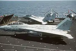 F-14 из 32-й истребительной эскадрильи ВМС США на палубе авианосца «Джон Ф. Кеннеди», 1986 год. Самолёты этой эскадрильи участвовали в инциденте 1989 года.