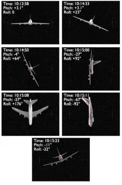 В 10:14:33 скорость упала до 416 км/ч. Несмотря на попытки автопилота сохранить левый крен в 22°, самолёт уже перешёл на правый крен под углом 23°. Сохранявшийся к тому времени тангаж в 3,1° уменьшился до 1,8°, после чего, задержавшись на данном уровне 5—6 секунд, вновь вернулся к первоначальному. Скорость кратковременно повысилась на 1 км/ч, но затем опять стала уменьшаться. Также самолёт начал опускаться со скоростью около 366 м/мин, при этом продолжая крениться вправо. В 10:14:50 самолёт опустился уже до 12 326 метров, когда скорость снизилась до 409 км/ч, после чего самолёт опустил нос вниз под углом 4° (командир выключил автопилот и направил нос вниз для увеличения скорости), а правый крен быстро дошёл до 64°. Одновременно элероны перестали кренить самолёт влево.