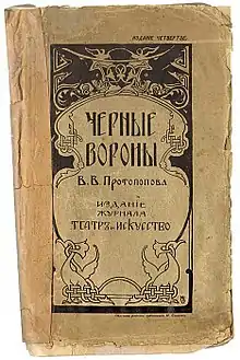 Иоаннитам был посвящён роман «Иоанниты», изданный в газете «Петербургский листок». В этом сочинении Иоанн Кронштадтский был изображён как псевдоцелитель, а его сторонники — иоанниты[12] как фанатики-сектанты. Роман послужил основой для создания одного из самых известных сочинений Виктора Протопопова — пьесы «Чёрные вороны». Пьеса была написана автором в Вологде, во время революции 1905 года, в ней Протопопов изобразил иоаннитов и Иоанна Кронштадтского в том же виде, как и в вышеупомянутом романе. Пьеса была напечатана в журнале «Театр и искусство» в 1907 году. Перед её публикацией Протопопов отправил своё произведение в Духовное ведомство миссионеру Булгакову, чтобы выяснить его взгляд и заключение о пользе или о позволительности постановки пьесы в театре. Булгаков ответил Протопопову на бланке петербургского епархиального миссионера, что не только «как знаток дела иоаннитов находит изображение их вполне отвечающим истине и действительности», но и благодарит Протопопова, что с помощью театра он задумал бороться с явлением, которое «кладёт пятно на Церковь»[13]. После этого Протопопов издал свою пьесу вместе с рецензией Булгакова. За два года это сочинение было переиздано ещё четыре раза. Пьеса была поставлена в Невском театре Неметти[14] в декабре 1907 года, где шла на сцене почти ежедневно при полном зале. Она была представлена публике во многих театрах Российской империи и имела огромный успех. Пьеса была переведена на французский, немецкий, итальянский, английский и армянский языки. Однако в «благонамеренной печати» появился ряд статей против «Чёрных воронов». Усилиями черносотенца епископа Курского и Обоянского Питирима (Окнова) пьесу «Чёрные вороны» местные власти запретили в Курске. Московские власти после обращения к ним монархистов постановку пьесы в Москве запретили. С целью запретить пьесу в Российской империи в Петербург приехали епископ Саратовский Гермоген (Долганёв), епископ Орловский Серафим (Чичагов) и протоиерей Иоанн Восторгов, 11 декабря 1907 года их принял император Николай II; в течение полутора часов Гермоген рассказывал монарху, как левая печать и общество травят болящего Иоанна Кронштадтского и в лице его православную церковь и веру. Царь по телефону передал приказ Петру Столыпину немедленно и везде снять с репертуара пьесу «Чёрные вороны»[15][16][17]. В 1917 году, после Октябрьской революции, в РСФСР запрет на пьесу отменили и в этом же году режиссёр Михаил Бонч-Томашевский и продюсер Пауль Тиман сняли художественный фильм «Чёрные вороны», поставленный по пьесе Протопопова.