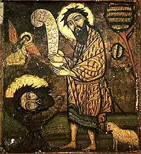 | Характерные черты | одежда из верблюжьей шерсти, длинные волосы и борода, книга, крест из тростника, чаша для крещения, медовые соты, агнец, посох |