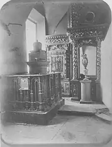 В 1741 году деревянный придел по причине ветхости был разобран, и могила Иоанна Максимовича оказалась под открытым небом у северной стены собора[21]. В 1753 году почитатели святителя собрали пожертвования и восстановили придел, освятив его во имя Иоанна Златоуста, небесного покровителя митрополита. Могила Иоанна располагалась у правой стены алтаря, над ней установили резное надгробие и портрет святителя.
