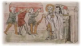 ![]() Перенесение гроба с телом Ярополка Изяславича в Киев; встреча гроба Всеволодом I, Иоанном II и жителями города: «…а Ярополка… отроци, несоша… к Киеву. И изидоша противу ему благоверный князь Всеволод… и блаженый митрополит Иоан, и чернирисци, и презвитеры. И вси кияне…» Миниатюра из Радзивилловской летописи. Конец XV века | ||