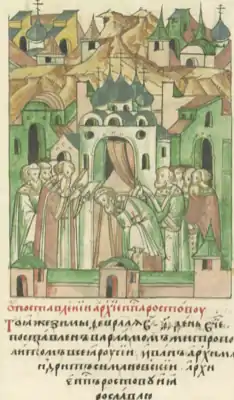 ![]() Митрополит Варлаам посвящает Иоанна IV в епископы ростовские | |