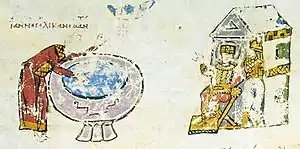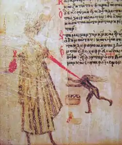 ![]() Миниатюра из Хлудовской псалтири: иконоборец Иоанн Грамматик изображён под ливанским кедром с торчащими дыбом волосами с кошельком и дьяволом | ||