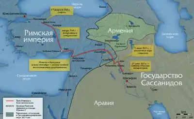 Когда отступающая армия подошла к Нисибису, император не стал входить в город, а приказал разбить лагерь за его стенами, так как ему было стыдно сдавать неприступный город неприятелю во время собственного пребывания там[50]. Жители Нисибиса просили императора дать им возможность самим, без помощи армии, оборонять свой город, но император отказал им и приказал покинуть его в течение трёх дней.