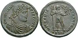 В связи с восстановлением господствующего положения христианства был снова введён в обиход лабарум — буквы «Хи» и «Ро» (Христос), убранные Юлианом, вновь появились на военных штандартах, о чём свидетельствуют монеты[73] (на которых, однако, император изображён не только с христианским лабарумом, но и с языческой богиней Викторией).