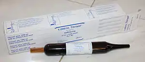 - Идею использовать в титриметрии реакцию перехода иода в иодиды в присутствии крахмала предложил французский ботаник Гутон де ла Бийардьер (1826) для определения хлорной извести[2][3]. Систематическое применение иодометрического метода в химическом анализе началось с работы Дюпаскье, использовавшего иодометрию для определения сероводорода в воде (1840)[4]. В 1853 году Бунзен предложил иодометрию в качестве общего метода определения окислителей; для титрования выделяющегося иода Бунзен использовал сернистую кислоту[3]. Тиосульфат натрия как реагент для титрования иода предложен в 1853 году Шварцем (Karl Leonhard Heinrich Schwarz, 1824–1890)[2][5][6].