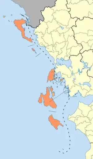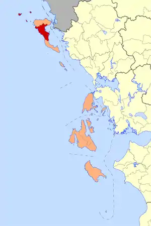 Включает в себя Ионические острова (за исключением отдалённой части — о́строва Китира и ряда близлежащих к югу от Пелопоннеса). Всего в состав периферии входят 32 острова, из них только 14 — обитаемые: Андипакси, Закинф, Итака, Каламос, Кастос, Керкира, Кефалиния, Пакси, Отони, Лефкас, Матракион, Меганисион, Эрикуса и острова Строфадес[2].