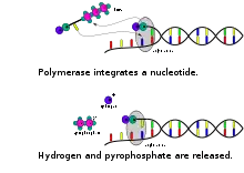 Включение дезоксирибонуклеотид трифосфата (dNTP) в растущую цепь ДНК происходит с образованием ковалентной связи и высвобождением пирофосфата и положительно заряженного иона водорода.[1][3][6] dNTP будет включен, только если он комплементарен ведущему непарному нуклеотиду матричной цепи. Ионное полупроводниковое секвенирование основано на том факте, что при замене одного вида dNTP на другой высвобождается ион водорода.