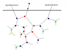 Налетающие тяжёлые частицы (чаще всего ионы) с кинетической энергией, большей некоторой пороговой эВ, соударяясь с поверхностью могут вызывать эмиссию атомов и молекул мишени. При энергиях в несколько сотен электронвольт падающий ион передаёт энергию одновременно многим атомам мишени, которые, в свою очередь, сталкиваются с другими атомами вещества. В конце серии столкновений наступает локальное равновесное распределение по энергии атомов со средней энергией , равной или превышающей работу выхода атома с поверхности. Большая часть атомов, принявших участие в каскаде столкновений, остаются связанными в твёрдом теле, но один или несколько могут покинуть поверхность[2].