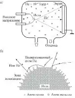 Изображающий газ вблизи иглы поляризуется в поле, а поскольку поле неоднородно, то поляризованные атомы газа притягиваются к поверхности иглы. Адсорбированные атомы могут ионизироваться за счет туннелирования электронов в иглу, и образовавшиеся ионы ускоряются полем в сторону экрана, где и формируется изображение поверхности-эмиттера. Разрешение полевого микроскопа определяется термической скоростью изображающего иона и при охлаждении иглы до низких температур может составлять до 0,1 нм, то есть иметь атомное разрешение.