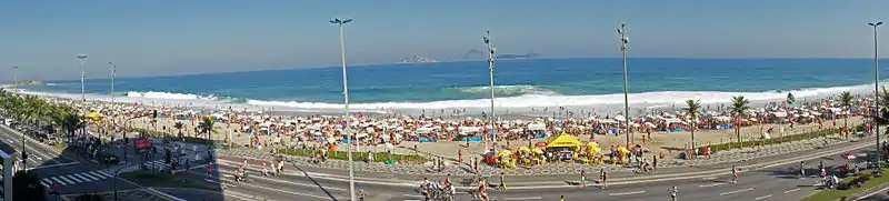 ![]() Пляж Ипанема. На заднем плане — гора Дойз-Ирманс (порт. Dois Irmãos) | |