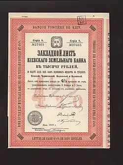 Земельные банки чаще размещали закладные листы на бирже, чем напрямую выдавали клиентам. Устав Херсонского земельного банка был утвержден в конце весны 1864 года. Банк выпускал 5,5 % закладные листы, выдавал кредиты под залог земли сроком на 35 лет, под 6 %. В начале XX века стал выпускать облигации. В 1871 году стал работать Харьковский земельный банк, в 1872 году — Санкт-Петербургско-Тульский[7]. Государственный дворянский земельный банк был основан в 1885 году, он занимался выдачей кредитов под залог земли при помощи закладных листов. Выигрышный облигационный 5 % заем на 80 миллионов рублей был выпущен в 1889 году. В 1890-х годах ипотечные ценные бумаги стали котироваться высоко: 4,5 % бумаги в диапазоне — 94 %-99,5 %, а 5 % — в диапазоне — 99,5 % — 102,5 %. В 1899—1902 годах курсы ценных ипотечных бумаг стали падать. Эта тенденция была связана сразу с несколькими факторами, одним из которых стало принятие закона в июне 1898 года, согласно которому учреждения долгосрочного кредита могли погашать закладные листы путем их покупки на бирже вместо погашения тиражей. В апреле 1892 года был издан закон, которым права акционерных земельных банков по выдаче городских кредитов были ограничены — выпуск закладных листов сократился, а их курс ненадолго перестал падать. Нестабильная ситуация и русско-японская война способствовали дальнейшему падению курса ипотечных бумаг. В 1910 году курс ипотечных бумаг стал повышаться, но затем вновь упал[8].