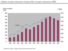 В то время как цены на жилую недвижимость росли[54], доля личных сбережений сокращалась, а величина кредитов и потребительские расходы росли. Если в конце 1974 г. общая сумма долговых обязательств домашних хозяйств составляла 705 миллиардов долларов (60 % личного располагаемого дохода), то в 2000 г. она составляла 7,4 триллионов долларов, а на конец второго квартала 2008 г. — 14,5 триллионов долларов (134 % личного располагаемого дохода)[55][56]. В 2008 г. в США в собственности членов одного типичного домашнего хозяйства находилось 13 кредитных карт, при этом 40 % владельцев имели задолженности по картам; в 1970 г. таких домохозяйств было всего 6 %[57]. С началом формирования пузыря на рынке недвижимости общая сумма полученных потребителями кредитов под залог увеличивавшейся стоимости домов выросла с 627 миллиардов долларов в 2001 г. до 1 428 миллиардов долларов в 2005 г., то есть почти на 5 триллионов долларов[58][59][60]. Если в 1990-х гг. сумма задолженностей по ипотечным кредитам составляла в среднем около 46 % ВВП, то к 2008 г. она составляла 73 % (10,5 триллионов долларов в денежном выражении)[61]. С 2001 по 2007 г. сумма задолженностей по ипотечным кредитам в США выросла почти в два раза, а размер задолженностей по ипотечным кредитам в расчёте на одно домашнее хозяйство при практически неизменном уровне заработной платы вырос более чем на 63 % (с 91 500 до 149 500 долларов)[49].