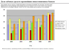 В 2004 г. Комиссией по ценным бумагам и биржам США было принято решение разрешить исключения из правил по объёму заёмного капитала, то есть измененить требования к допустимому объёму заёмного капитала инвестиционных банков США. Увеличение допустимых размеров заёмного капитала позволило банкам приобретать большее число ипотечных ценных бумаг. В период с 2004 по 2007 г. пять самых крупных инвестиционных банков США значительно увеличили долю заёмного капитала, то есть свой финансовый леверидж (см. диаграмму), что привело к росту уязвимости банков в случае падения цен на ипотечные ценные бумаги. Общая сумма долговых обязательств этих пяти учреждений за 2007 отчётный год составила более 4,1 триллиона долларов США, то есть около 30 % номинального ВВП США за 2007 г. Более того, доля субстандартных ипотечных займов в общей сумме выданных кредитов выросла с менее 10 % (2001—2003 гг.) до 18-20 % (2004—2006 гг.), в том числе из-за дополнительного финансирования рынка кредитования инвестиционными банками[26][27].