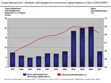 Традиционно в США доля ипотечных кредитов с высокой долей риска находилась на низком уровне в 8 %; в 2004—2006 годах она выросла до приблизительно 20 % от общего числа выданных ипотечных кредитов (и даже выше в некоторых регионах США)[1][2]. Значительную часть (в 2006 г. более 90 %) составляли кредиты с плавающей процентной ставкой[3]. Увеличение доли субстандартных кредитов[ком. 1] было одним из проявлений более общей тенденции снижения стандартов кредитования, а также вывода на рынок более рискованных ипотечных продуктов[3][4]. При этом потребительское кредитование в США приобретало всё большую популярность: в конце 2007 г. доля долговых обязательств от общей суммы располагаемого личного дохода выросла до 127 % (в 1990 г. она составляла 90 %), что в значительной мере было вызвано широким распространением ипотечного кредитования[5].