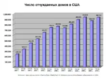 В августе 2008 г. 9,2 % американских заёмщиков с непогашенными ипотечными кредитами или признали своё банкротство, или передали недвижимость в собственность кредитора[36]. К сентябрю 2009 г. их число увеличилось до 14,4 %[37]. С августа 2007 г. по октябрь 2008 г. в США был завершен процесс отчуждения 936 439 объектов жилой недвижимости[38]. В нескольких штатах как общее количество, так и доля отчуждений имущества были значительно выше, чем в среднем по стране[39]: в 2008 г. на десять штатов приходилось 74 % случаев передачи залогового имущества кредиторам, при этом в двух штатах (Калифорния и Флорида) произошёл 41 % всех отчуждений. В девяти штатах доля случаев отчуждения жилой недвижимости была выше, чем средняя по стране (1,84 % домохозяйств)[40].