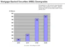 Между третьим кварталом 2007 года и вторым кварталом 2008 года в более низкую категорию кредитного рейтинга были переведены ипотечные ценные бумаги общей стоимостью в 1,9 триллионов долларов США. Во многих финансовых организациях для сохранения требуемого коэффициента покрытия капитала сочли необходимым снизить стоимость своих ипотечных ценных бумаг и приобрести дополнительный капитал. Если для этого осуществлялся выпуск дополнительных акций, то стоимость акций, уже находящихся в обращении, падала. Таким образом, понижение кредитного рейтинга ипотечных ценных бумаг привело к падению цен на акции многих финансовых корпораций[116].