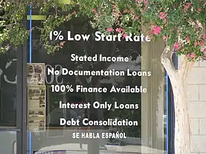 Другим примером новых видов кредитов, созданных для привлечения новых заёмщиков, является ипотечный кредит с плавающей ставкой (англ. adjustable-rate mortgage, ARM), по условиям которого в течение первоначального периода осуществляется выплата только процентов по кредиту (а не основной суммы долга). Ещё один пример — кредит с «вариантами оплаты» (англ. "payment option" loan), когда заёмщик имеет право самостоятельно выбирать размер ежемесячных выплат, но если при этом ссудные проценты не покрываются, то разница прибавляется к основной сумме долга. В 2005—2006 гг. многие заёмщики (почти один из десяти) воспользовались кредитами с такими условиями. При этом вполне возможна ситуация, в которой величина остаточной задолженности по кредиту продолжала бы расти из-за того, что выплаты были слишком низкими[49]. По некоторым оценкам, треть кредитов с плавающей процентной ставкой, выданных в 2004—2006 гг., в течение первоначального срока предоставлялась с льготной процентной ставкой ниже 4 %, по завершении которого ставка значительно увеличивались, так что ежемесячные выплаты могли вырасти даже в два раза[85].
