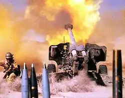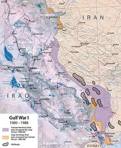 Ирано-иракская война, Первая война в Персидском заливе, или Первая война в заливе (22 сентября 1980 года — 20 августа 1988 года) — вооружённый конфликт между Ираком и Ираном. Войне предшествовали серия территориальных споров между Ираном и Ираком, мотивированных желанием Ирака отторгнуть от Ирана богатую нефтью провинцию Хузестан[22] (Арабистан[23]) с арабским населением и восточный берег реки Шатт-эль-Араб, а также споры между двумя странами за лидерство среди государств в Персидском заливе. Ирано-иракская война явилась последним крупным конфликтом в рамках холодной войны[24] и одним из наиболее длительных вооружённых конфликтов XX века[24][25][26].