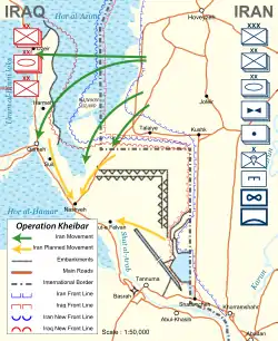 17 марта 1982 года Иран начал операцию «Фатима», развернув наступление на Ховейзе. 14-я иракская дивизия выдвинулась для обороны города, в то время как иранские десантники в ночь на 22 марта высадились в иракском тылу и уничтожили около сорока 130-миллиметровых орудий. Части КСИР при поддержке артиллерии и танков 92-й бронетанковой дивизии наступали на Шуш, применяя тактику «живых волн», но прорвать иракскую оборону им не удавалось[135]. В ночь на 24 марта началась вторая фаза иранского наступления. Несмотря на каменистый ландшафт и вызванные им массовые поломки техники, 21-я и 84-я мотопехотная дивизии сумели зайти иракцам во фланг. Самолёты иракских ВВС, вызванные для авиаподдержки, в ходе воздушных боёв и обстрела ПВО потеряли 6 самолётов против 3 сбитых ими иранских. 25 марта иранцам удалось обойти иракские укрепления[136]. В ходе последовавшей контратаки иракская пехота понесла большие потери, стала реальной угроза окружения иракской группировки. Командиры двух оборонявшихся дивизий запросили у генштаба отступление, но им было в этом отказано[137]. 26 марта в ходе танковых боёв 10-я бронетанковая дивизия Ирака потеряла всю артиллерию и две трети своих танков, её остатки отступили. 1-я мотопехотная дивизия, брошенная ей на выручку, была практически полностью уничтожена, её командующий генерал Дахиль Али Хиляли сдался в плен[138].