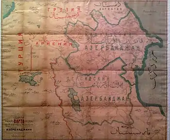 Название Азербайджан в применении к Азербайджанской Республике было впервые официально использовано 27 мая 1918 со стороны членов мусульманской фракции Закавказского сейма, которые на своём заседании приняли решение провозгласить независимость Азербайджана, объявив себя Временным Национальным советом Азербайджана[39]. Тем самым была заложена основа для будущей парламентской республики. На этом собрании были избраны президиум и председатель Национального совета Азербайджана, которым стал Мамед Эмин Расулзаде[40]. Этим актом предполагалось объединить со созданной в 1918 г. на территории двух исторических областей Закавказья — Ширвана и Аррана Азербайджанской Демократической Республикой иранскую провинцию Азарбайджан[31][36] с подавляющим тюркоязычным населением.