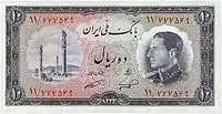 10 риалов | 130 × 67 | Серый | Мохаммед Реза Пехлеви | Императорская печать Дария I | |