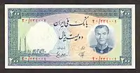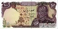100 риалов | 142 × 71 | Коричневый | Мохаммед Реза Пехлеви дворец Саадабад |