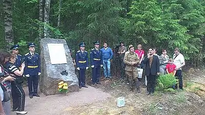 У памятного знака рядом с местом гибели танкового экипажа Н. А. Фатеева и Ю. Л. Харитонского.