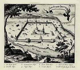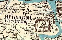 Ряд исследователей относит возникновение Иркутска к 1620 году, другие считают, что в 1650-е годы на острове Дьячем существовало постоянное зимовье русских[36]. Основанию Иркутского острога предшествовал выход русских к Байкалу в 1643 году. Это был один из многочисленных острогов в Восточной Сибири, поставленных для сбора ясака. Первым приказчиком нового острога был назначен казачий десятник Василий Ездаков. К концу 1660-х годов строения острога сгнили, оборонительное сооружение было выстроено заново. Вокруг него вырыли ров, за стенами возник посад. В 1672 году построена первая деревянная церковь — Спасская. В 1682 году острог становится центром Иркутского воеводства, объединяющего все остроги Прибайкалья. Резиденцией воеводы становится государев двор. В 1686 году Иркутску присвоен статус города[37].